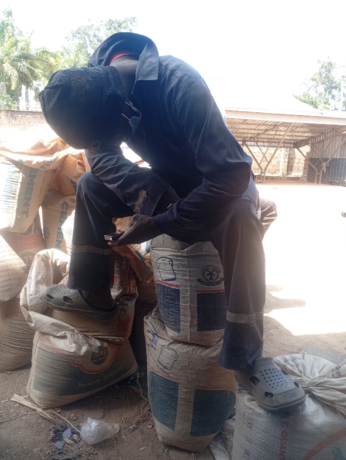 An adult male subject is seated outdoors amidst numerous stacked and scattered beige woven polypropylene sacks on a dirt ground. He is wearing a dark blue hooded jumpsuit or overalls, a black knitted beanie, and a light blue face mask around his chin. His head is tilted downwards as he examines a small, light-colored rectangular object, consistent with a mobile phone, held in his hands. His feet are clad in grey slip-on clogs, resting on the sacks. Visible labels on the sacks include "50KG Bakers Delight," "CEMENT," and graphics depicting a loaf of bread, suggesting contents such as flour and cement. One sack is labeled "25KG QUANTITY." A clear plastic bag and some debris are on the ground near his left foot. In the background, a light-colored brick wall, palm trees, and an open-sided structure with a corrugated metal roof supported by wooden beams are visible. The scene is brightly illuminated by direct sunlight. The precise location within the city of Jos, Nigeria, is not identifiable from the visual evidence.