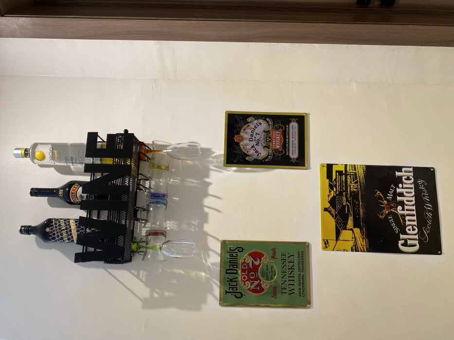 - "A static, eye-level photograph taken in Ojomu, Nigeria, displays a section of a light-colored, textured interior wall decorated with alcoholic beverage-themed items" by FM-kPMgB2, licensed under CC BY 4.0