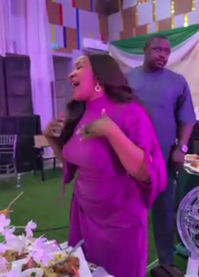 A woman in a purple dress is dancing in front of a table with food on it. She has long brown hair and is smiling. Behind her stands a man in a grey shirt and glasses, watching her. The room appears to be decorated for an event with a green grass-like floor covering, white curtains, and green and white fabric draping in the background. There are speakers and chairs in the periphery, along with a wall decorated with multicolored rectangles. The table in the foreground is cluttered with plates of food and decorative flowers.