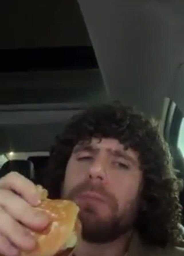 man with curly brown hair eating a burger in what appears to be the driver's seat of a car
