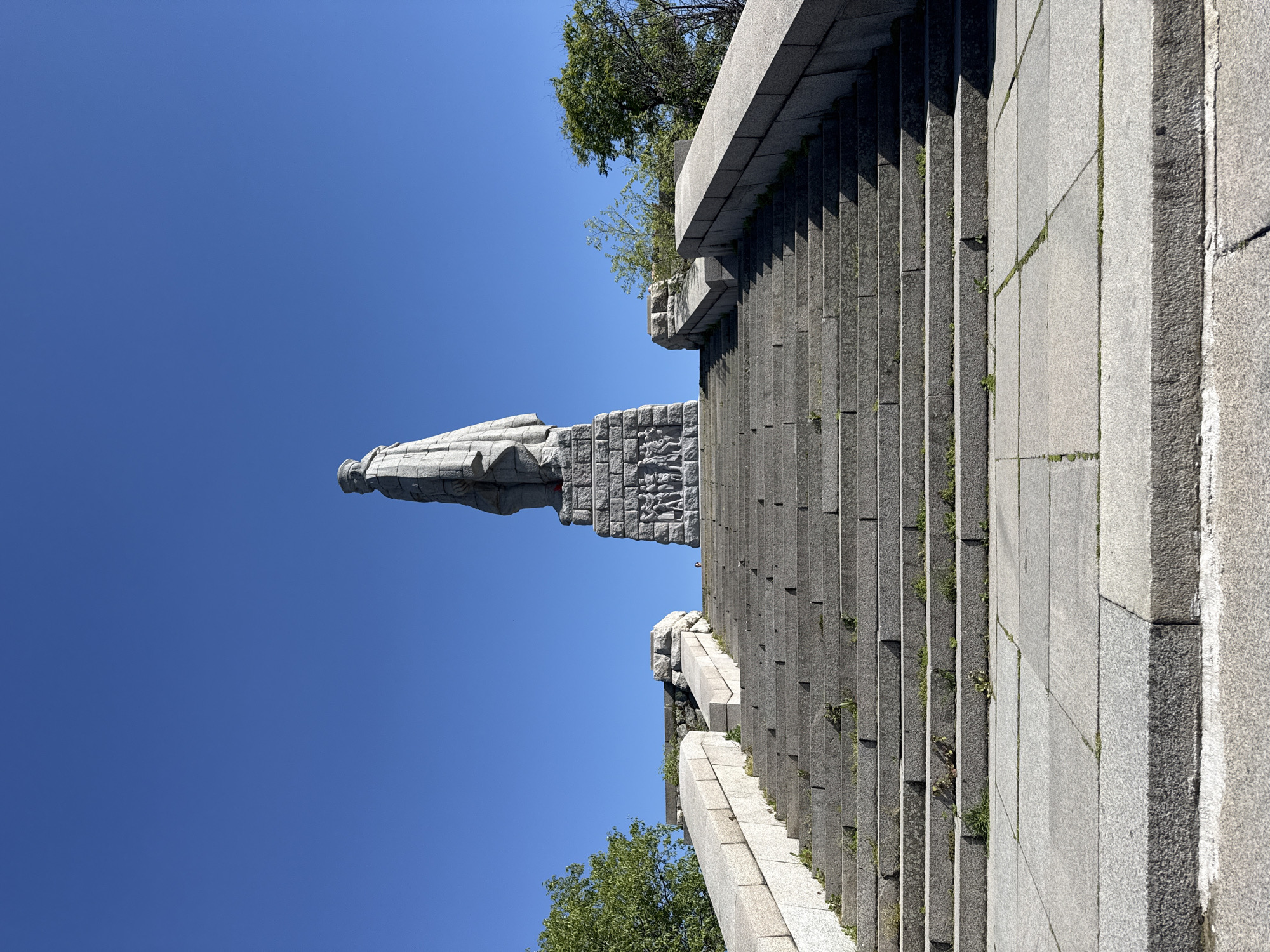 Alyosha Monument in Plovdiv, Bulgaria, viewed from a low angle, facing upwards towards the sky. The monument comprises a tall stone statue of a Soviet soldier atop a stepped pedestal. The statue is facing left, and appears to be wearing a long coat. The pedestal is decorated with relief carvings. To the right of the monument are long stone stairs. Some vegetation is visible on the steps and at the base of the monument. The sky is clear and blue.