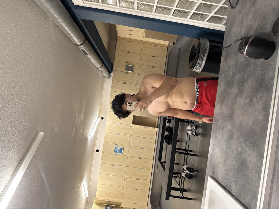 An interior mirror selfie depicts a shirtless male in a locker room, likely a gymnasium or sports facility