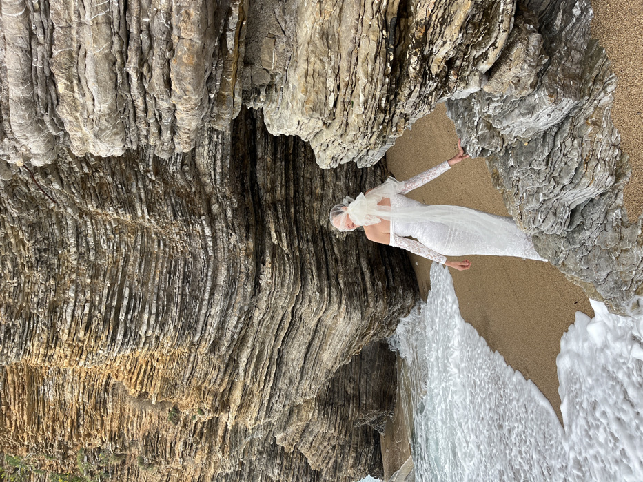 A single female individual stands on a sandy beach in Sveti Stefan, Montenegro, positioned between the sea and a towering cliff face. The background is dominated by a large formation of horizontally layered sedimentary rock, exhibiting shades of grey and tan, with visible crevices and overhangs. To the left, white foamy waves from the sea are breaking and receding onto the light brown sand. The female wears a long, form-fitting, off-the-shoulder white dress with long sleeves, appearing to be constructed from lace or textured fabric. Her face is entirely obscured by a white, sheer veil, which is wrapped around her head and tied in a large, intricate bow at the back, with a long piece of fabric extending downwards. Her left hand is resting on a prominent grey rock formation to her immediate right, while her body is angled slightly towards the left.