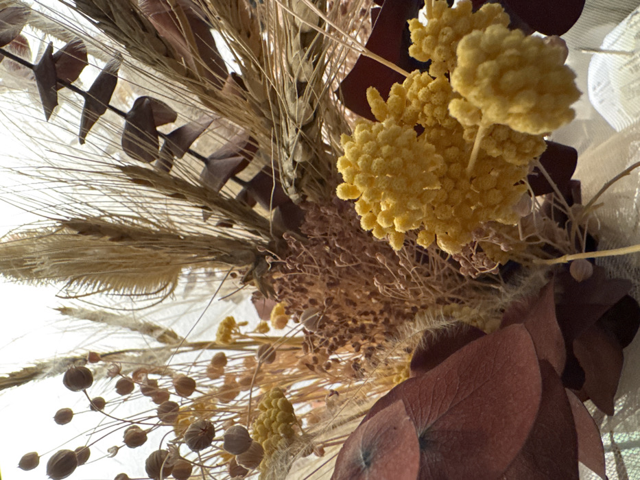 The scene is situated in the city of Andratx, Spain. The image displays a close-up, vertical composition of a dried floral arrangement. Dominant elements include bright yellow, spherical flower clusters, resembling dried Craspedia, prominently featured in the lower right. Interspersed are multiple stalks of dried grains, likely wheat, exhibiting light brown and tan coloration with visible husks and awns. Dark reddish-brown, broad, flattened leaves, consistent with dried eucalyptus, are visible in the lower left quadrant. Numerous slender stems bear small, round, light brown seed pods, possibly flax. Smaller, reddish-brown, textured clusters of dried flowers or seed heads are present throughout the mid-ground. Darker, elongated, segmented dried pods or husks are discernible in the upper right. The background is overexposed and appears white, providing no discernible environmental context beyond the arrangement itself. No individuals, actions, or specific interactions are depicted.