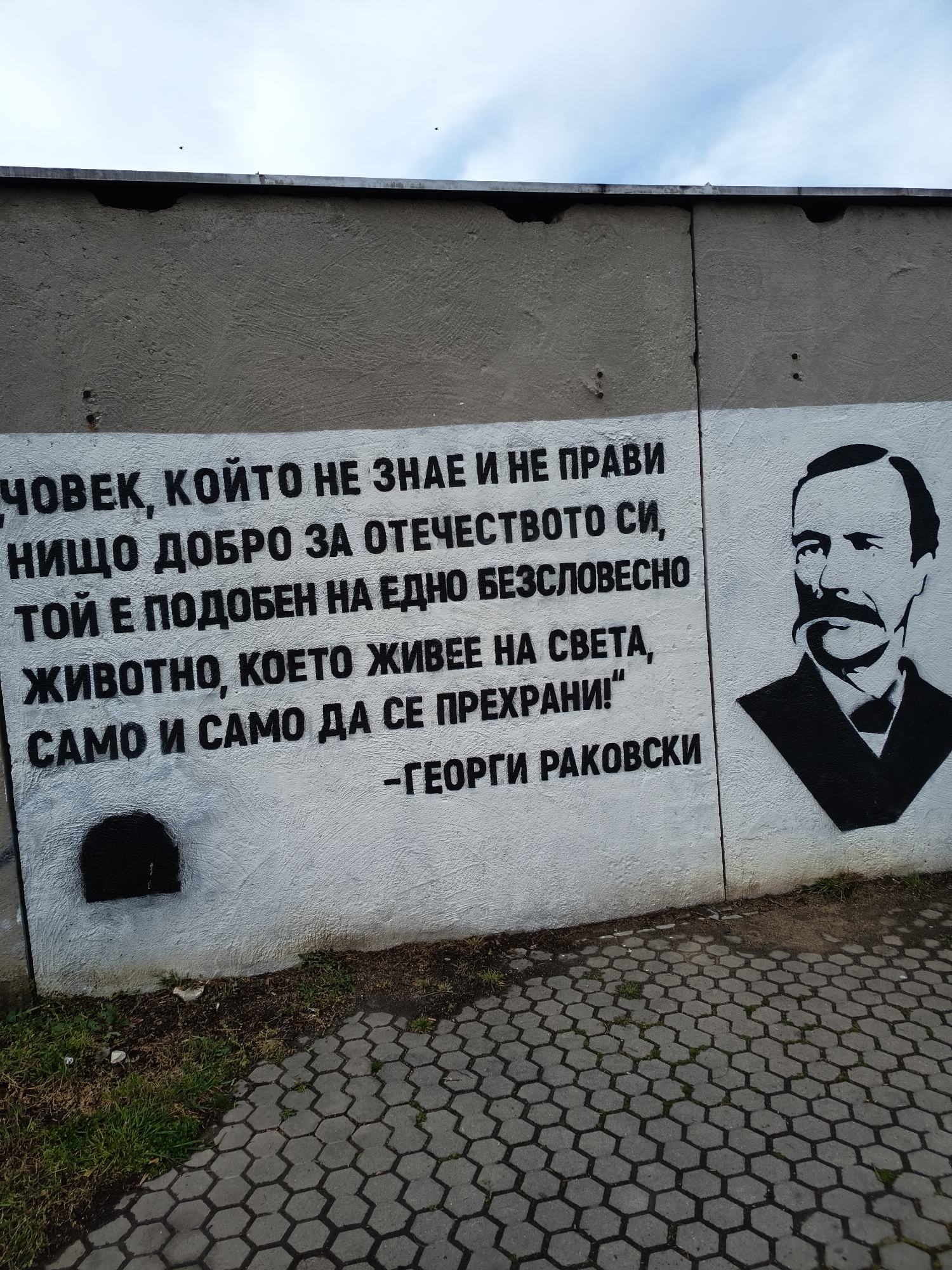The image displays an outdoor scene in Pazardzhik, Bulgaria, primarily featuring a segmented wall with graffiti under an overcast sky. The wall is horizontally divided; the upper portion is gray, exhibiting a rough, textured finish with some minor chips along its top edge. The lower portion is painted white, with a faint metallic sheen, and is vertically bisected by a seam. On the left panel of the white section, black Cyrillic text is spray-painted, reading: "ЧОВЕК, КОЙТО НЕ ЗНАЕ И НЕ ПРАВИ НИЩО ДОБРО ЗА ОТЕЧЕСТВОТО СИ, ТОЙ Е ПОДОБЕН НА ЕДНО БЕЗСЛОВЕСНО ЖИВОТНО, КОЕТО ЖИВЕЕ НА СВЕТА, САМО И САМО ДА СЕ ПРЕХРАНИ!" (A man who does not know and does nothing good for his fatherland, he is like a senseless animal that lives in the world only and only to feed itself!). Below this quote, the attribution "-ГЕОРГИ РАКОВСКИ" (GEORGI RAKOVSKI) is present. On the right panel, a black stencil portrait of Georgi Rakovski is depicted, showing a man with a prominent mustache and beard, wearing a collared shirt and jacket. A small, black, arch-shaped stencil is situated on the lower left of the white wall section, near the ground. The ground in the foreground consists of hexagonal gray paving stones. Patches of green grass are visible growing between the pavers and along a narrow strip of soil at the base of the wall, particularly on the left side where the vegetation is more dense. The sky above is partly cloudy, presenting a mix of light blue and white/gray hues. Two small, dark birds are observed in flight in the upper right area of the sky. The scene is illuminated by diffused daylight.