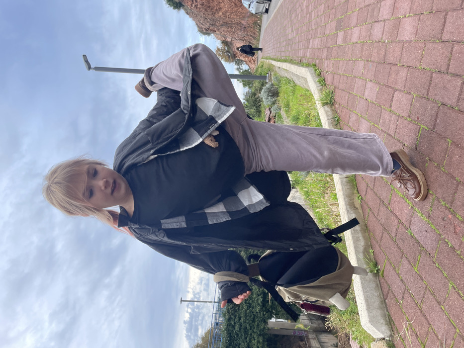 - "An individual with blonde hair, partially styled in a pink-tinted ponytail, is depicted balancing on their right leg, with the left knee bent and foot raised, on a red brick-paved sidewalk in Podličak, Montenegro" by FM-oln9s2, licensed under CC BY 4.0