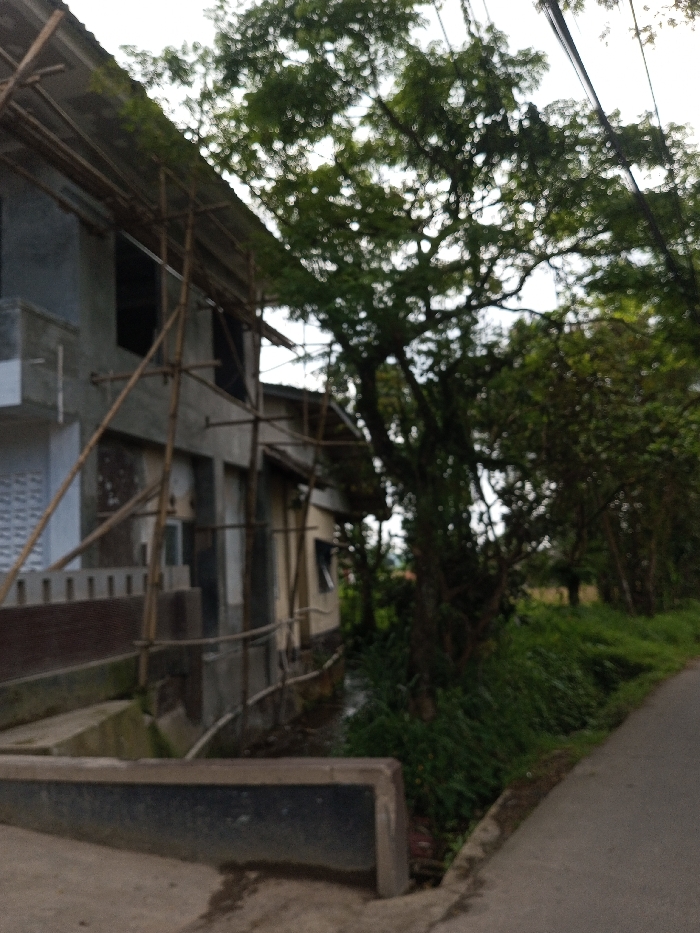 The image depicts a static outdoor scene in Ariyalai, Sri Lanka. On the left, a two-story building, appearing to be under construction, features an unfinished grey concrete or stucco facade with multiple open window and door frames. Bamboo scaffolding is erected around the building's exterior. A partial view of an adjacent, lighter-colored structure is visible behind the main building. Running parallel to the building and extending into the mid-ground is a narrow water channel or ditch, bordered by dense green vegetation and tall grasses. A dark paved road occupies the right side of the frame, leading from the lower right foreground into the background. Overhead utility lines are faintly discernible against an overcast sky in the upper right quadrant. A concrete curb is present in the lower left foreground. No individuals are depicted.