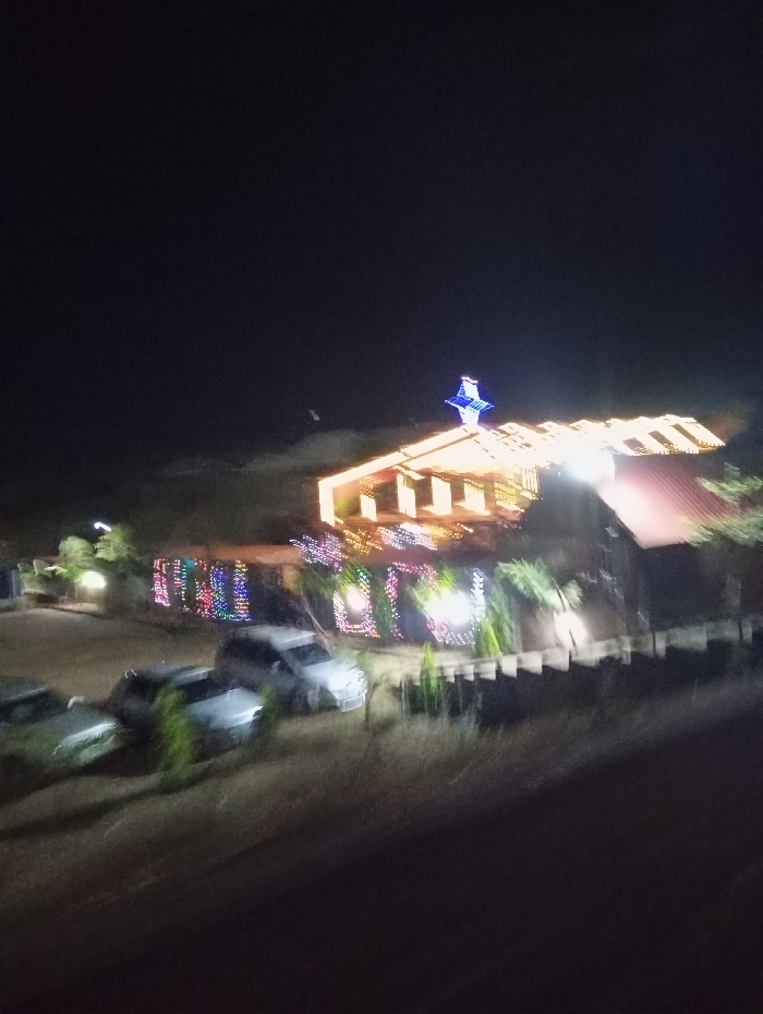 At night, a building, possibly a church, is adorned with colorful lights and a star on top. Three cars are parked in front of the building. There are plants, possibly small trees, between the building and the road where the image appears to be taken from. The image is blurry, suggesting movement during the shot.