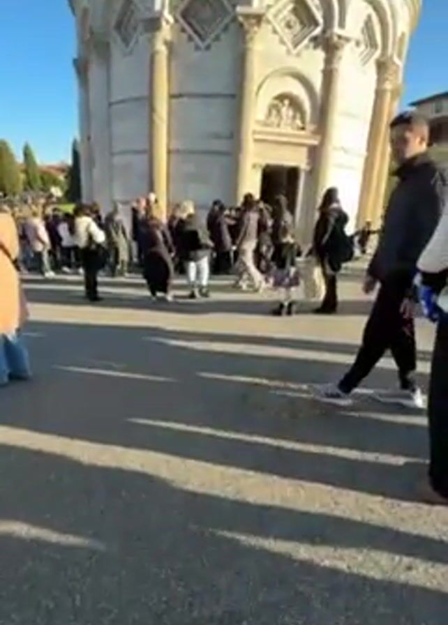 Leaning Tower of Pisa from ground level on a clear, sunny day. The base of the tower is visible, along with a small crowd of people. Some are walking, others are standing and looking up at the tower. A man in a dark jacket and light-colored athletic shoes is walking in front of the camera and waves. The tower is prominently in the center of the frame, tilting significantly. The sky is clear blue, and the tower is made of light-colored stone.