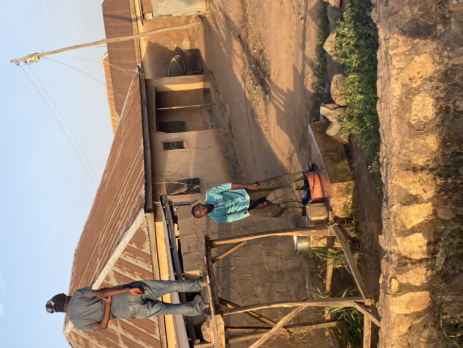 Two men stand outside a building. One man, wearing jeans and a blue shirt, stands on the ground and appears to be plugging something into a car battery or similar power source. The other man stands on a wooden scaffold attached to the building, wearing jeans and a grey shirt. The building has a corrugated metal roof and a stone and concrete block exterior. A utility pole is visible near the building, and stone steps lead up to a higher ground level.