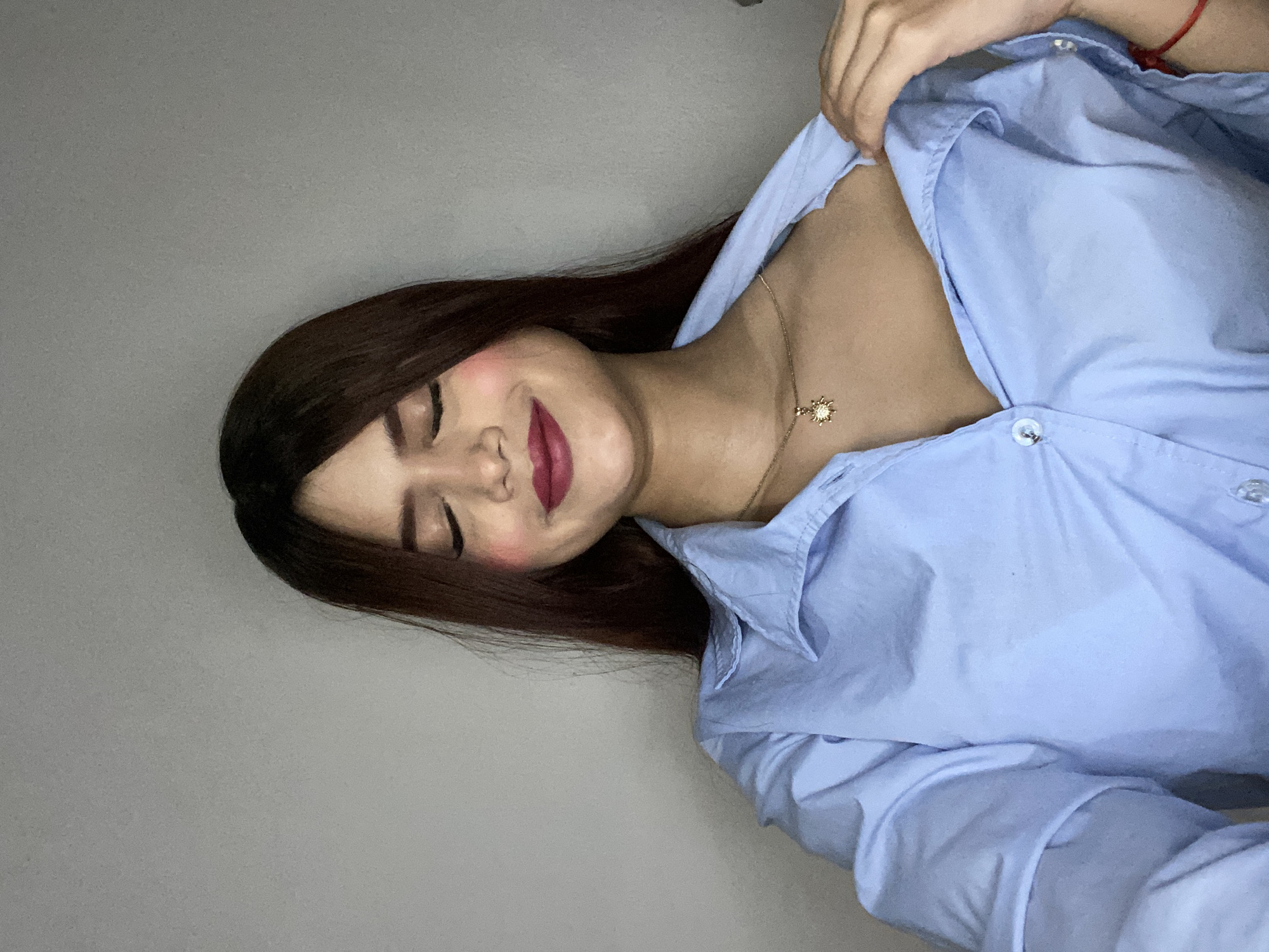 woman with long brown hair and fair skin wearing a light blue button-down shirt and a gold necklace. Her eyes are closed, and she is smiling slightly. She has pink blush on her cheeks and dark pink lipstick. The background is a plain gray wall. The image is taken indoors, and the woman appears to be posing for the photo. There is no evidence in the image to suggest it was taken in Juan Griego, Venezuela or any other specific location.