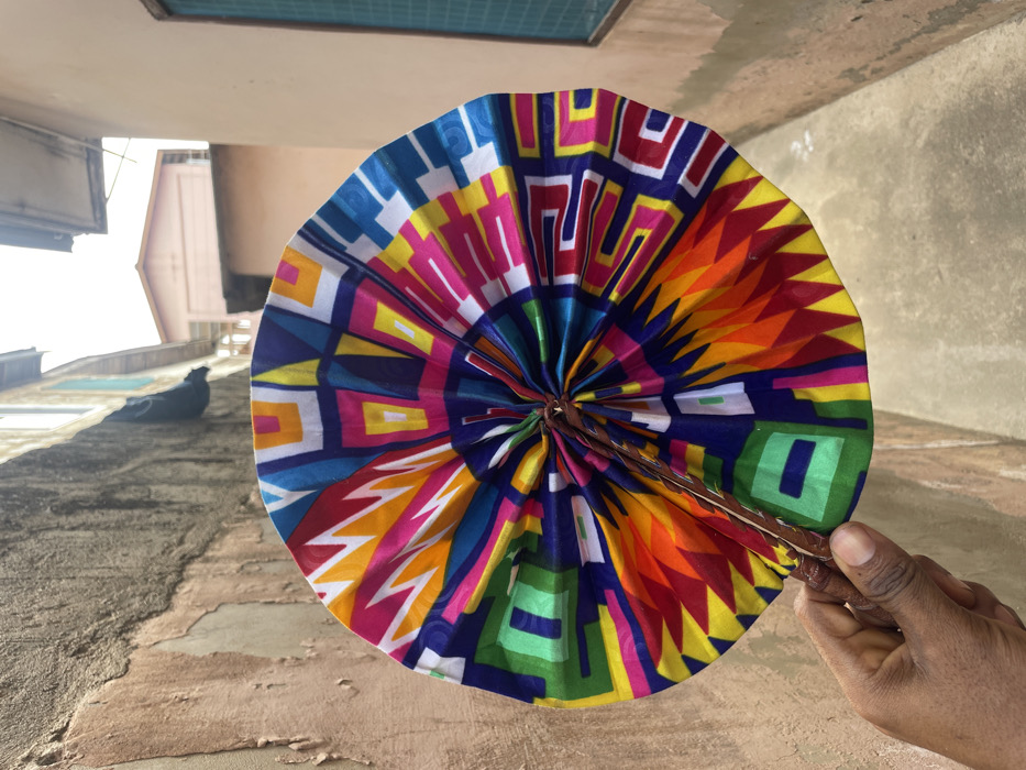 A dark-skinned hand holds an open, circular hand fan, positioned centrally in an urban alleyway in Accra, Ghana