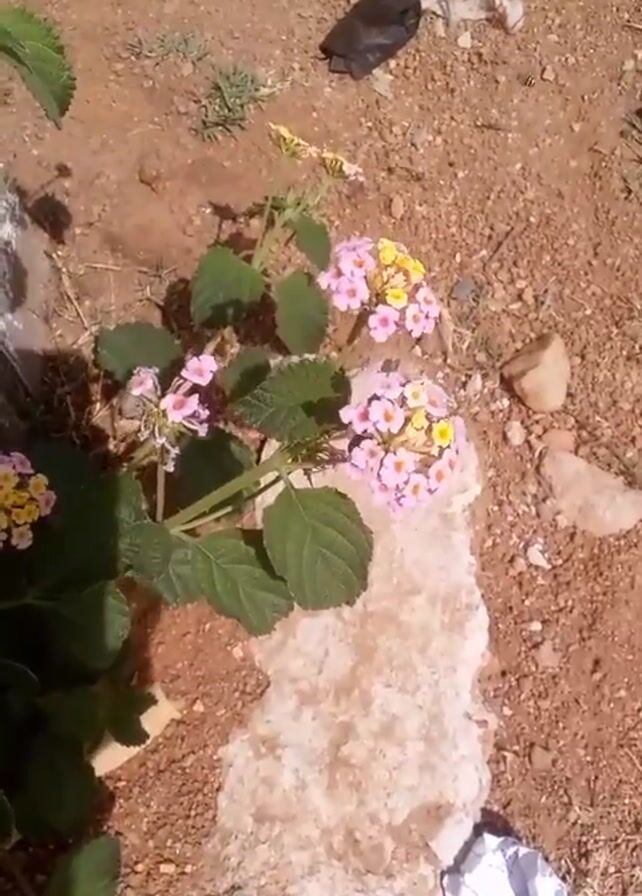 small plant with clusters of pink and yellow flowers, growing next to a large, irregular white rock. The ground is reddish-brown and covered with small pebbles and bits of debris, including a black plastic bag and a crumpled piece of white paper. The plant has green leaves, and its flowers are concentrated in several round clusters. The camera angle is from above, looking down at the plant and its surroundings. The lighting is bright and sunny.