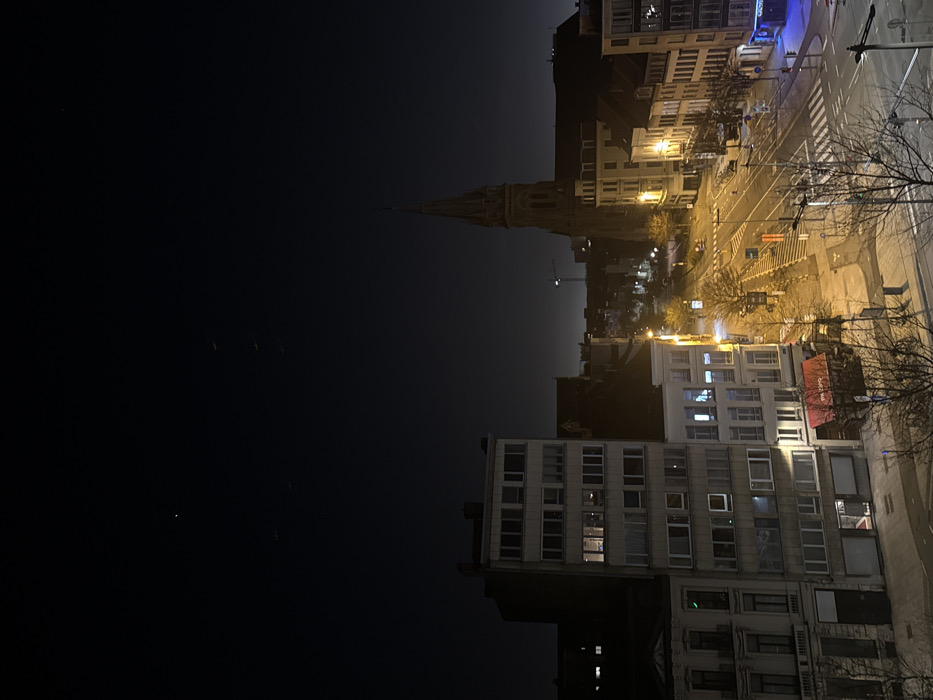 The image depicts an urban cityscape at night in Antwerp, Belgium, viewed from an elevated position overlooking Lange Nieuwstraat towards the south. The dominant feature in the midground is the illuminated steeple and upper structure of Sint-Jacobskerk (Saint James' Church), centered towards the right. The sky occupies the upper approximately 40% of the frame and is dark black, indicating nighttime. Several faint, indistinct light sources are visible in the upper portion, potentially stars or distant objects. Below the horizon line, the city extends into the dark. On the left side, a multi-story building, approximately seven floors high, stands prominently. Its facade appears light-colored or concrete, with several windows dimly illuminated on the third and fifth visible floors. Adjacent to this building are other traditional European structures. The street level in the lower half of the image shows a wide intersection, identified as Lange Nieuwstraat at its junction with Kipdorp/Jezusstraat. The streets and sidewalks are primarily illuminated by yellow-orange streetlights, casting distinct shadows. Bare-branched deciduous trees are scattered along the sidewalks and median. Road markings, including white lane lines and crosswalks, are visible on the asphalt. Traffic signals are present at the intersection, with some lights visible but not clearly indicating active traffic. On the right side of the street, additional multi-story buildings line the thoroughfare, some with illuminated windows and shopfronts. One building displays a red awning, and another on the far right has a distinct blue light emanating from a ground-level establishment. In the far background, beyond Sint-Jacobskerk, a faint glow from city lights is visible, and the silhouette of a construction crane is discernible against the hazy horizon line. No people or active vehicles are discernibly present in the scene.