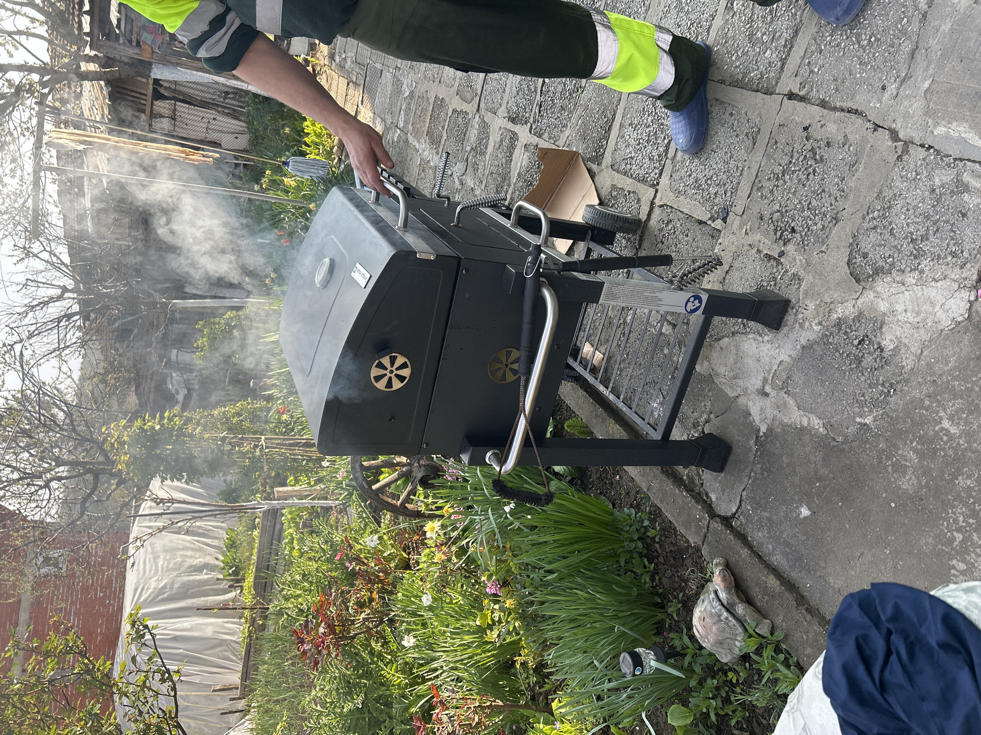 The image depicts a person operating a black charcoal grill in an outdoor setting. The person is wearing green and yellow work pants and blue rubber boots. Smoke is emanating from the grill. The grill is placed on a stone-paved surface next to a garden with flowers and greenery. In the background, there is a wooden structure and a brick building. There also appears to be a turtle statue next to the grill. This location may be in Bukovlak, Bulgaria.