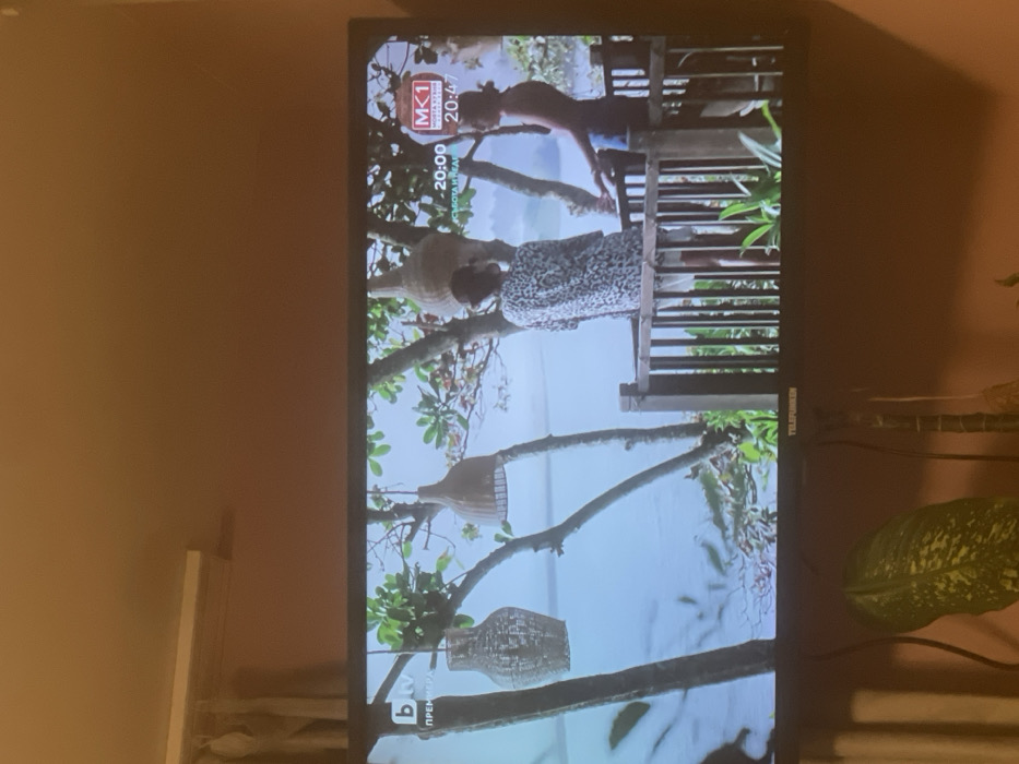 This image depicts an interior in Dragijevo, Bulgaria. A black flat-screen Telefunken television is mounted against a light orange-tan wall. Dark cables descend from behind the television. A large green houseplant with variegated leaves partially obscures the lower-left of the screen. A light-colored curtain or blind is visible in the upper-left of the room. The television displays an outdoor scene featuring a calm body of water in the background. Green foliage and tree branches with three suspended, woven, basket-like pendant lights frame the view. A wooden railing structure, possibly a deck or balcony, is visible on the right. Two individuals are on this structure: one person, seen from behind, wears a light-colored, patterned garment and faces the water; a second person, partially visible on the right, wears a dark top and faces the first individual. On-screen graphics include the "bTV" logo with "ПРЕМИЕРА" (PREMIERE) in the top-left, and the "MK1" logo with "МОЯТА КУХНЯ" (MY KITCHEN), "СЪБОТА И НЕДЕЛЯ" (SATURDAY AND SUNDAY), and "ПРЕДАВАНЕ" (BROADCAST) in the top-right. Timestamps "20:00" and "20:47" are also present on the screen.