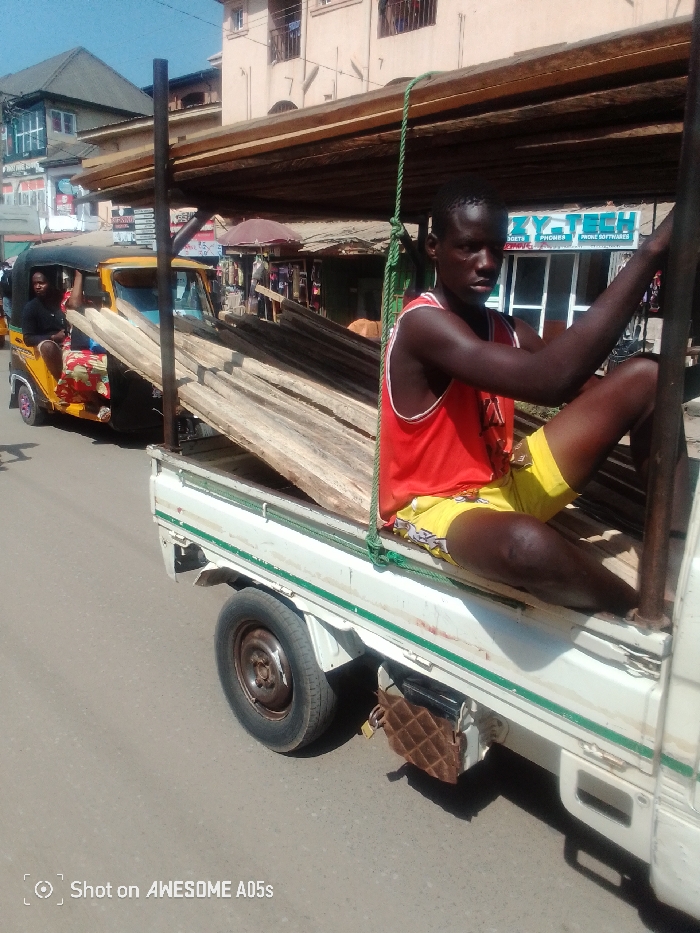 The image depicts a street scene in Egbagu, Nigeria, under daylight conditions. In the foreground and occupying the majority of the frame is the rear section of a small white pickup truck with a green stripe along its side. The truck's bed is laden with numerous rough-hewn wooden planks, stacked horizontally. A young, dark-skinned male is seated on top of these planks, facing forward and slightly to the right, holding onto a vertical metal post that forms part of a makeshift wooden roof structure extending over the cargo. He is wearing a red sleeveless jersey with white trim and yellow shorts. A green rope is visible, seemingly securing the cargo or part of the structure. Behind the pickup truck, to the left, is a yellow and black motorized tricycle (locally known as a Keke NAPEP or Okada) transporting passengers. At least two individuals are visible inside the tricycle; one, a dark-skinned female, is looking towards the left. The vehicles are on a paved road. The background features various buildings. On the left, a multi-story building with a dark-colored peaked roof and windows is visible. To the right, behind the tricycle and truck, are commercial structures. One prominent sign, partially obscured, reads "ZY-TECH" with smaller text below, possibly indicating "PHONES & PHONE SOFTWARE." Market stalls with goods are also discernable. The sky is clear and blue. The overall scene suggests a busy urban or semi-urban environment.