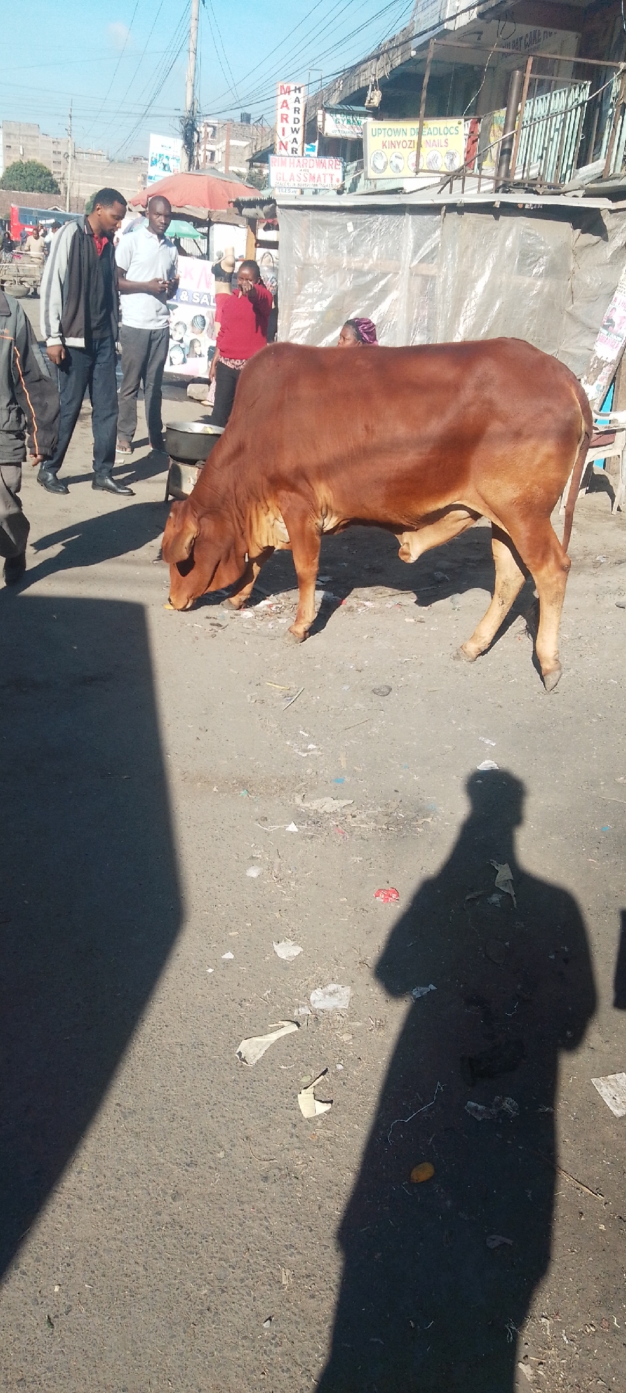 The image depicts a brown cow standing in a street in Nairobi, Kenya, grazing on refuse. Several people are standing nearby and in the background, including 3 men, one in a grey shirt, and one in a black jacket. The scene suggests a busy urban area, with commercial signs and other buildings visible in the background. The street surface is littered with trash. The shadow of the photographer is visible in the foreground. One of the signs in the background says "Uptown Dreadlocks".
