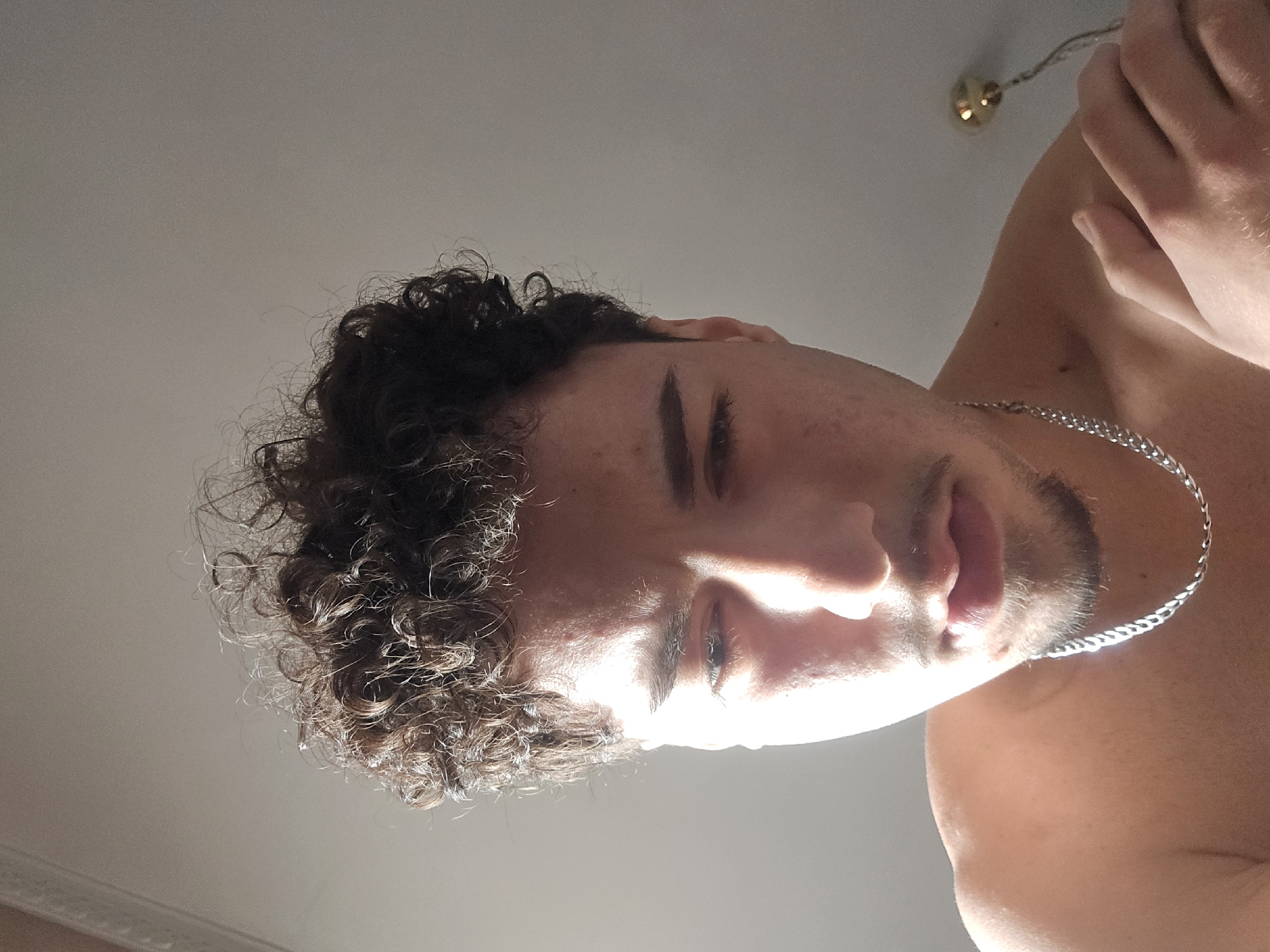 The image presents a close-up, low-angle portrait of a young adult male in an indoor setting. He has short, dark, curly hair and prominent dark eyebrows. His complexion is light, with visible epidermal irregularities on his face. He exhibits minimal facial hair, consistent with a short goatee. The subject is shirtless, revealing his bare shoulders and upper chest, and wears a silver-colored cuban link chain around his neck. His right hand is visible, resting on his left shoulder. His gaze is directed downwards, and his mouth is slightly ajar. Strong directional lighting originates from the upper left of the frame, illuminating the subject's left side. The background consists of a uniform, light-toned wall or ceiling. A segment of white decorative molding is visible in the upper left corner. To the right of the subject's shoulder, a small, spherical, gold-toned fixture, consistent with a wall-mounted light or decorative item, is present, secured by a visible wire. The visual information within the image does not provide sufficient detail to ascertain a specific location within the city of Sofia, Bulgaria, beyond being an interior space.