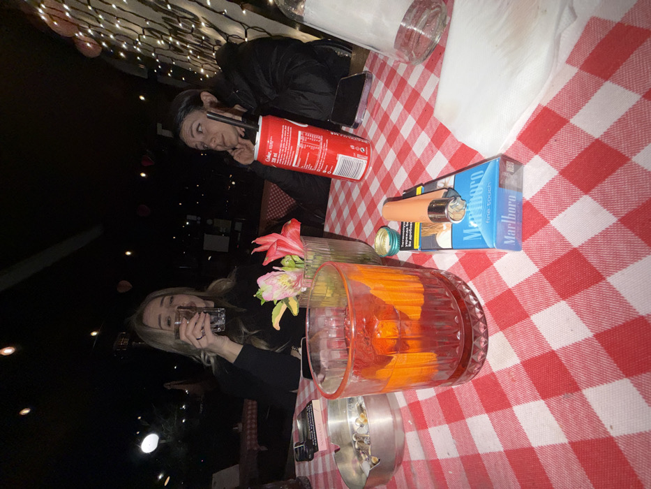 This image depicts a night-time scene at an outdoor establishment in Blagoevgrad, Bulgaria. Two adult females are seated at a table draped with a red and white checkered tablecloth. The female on the left, with light hair, wears a dark long-sleeved top and is observed holding a clear glass containing liquid to her mouth, engaged in drinking. A ring is present on her left ring finger. The female on the right, with dark hair and a dark puffer jacket, rests her left hand near her face while looking toward the left. A red 330ml Coca-Cola can with a black straw is positioned in front of her; its label features nutritional information in Cyrillic script. The table features a prominent clear glass tumbler containing a dark red liquid with multiple large, cut orange slices submerged. Adjacent to it, a clear ribbed glass vase holds a small arrangement of pink and yellow alstroemeria flowers. To the left of the tumbler, a silver circular ashtray contains numerous cigarette butts, positioned next to a dark-colored cigarette pack, partially revealing "SOBRANIE" text. To the right, a blue and white Marlboro Fine Touch cigarette pack is present, topped by an open orange disposable lighter. A small, inverted green bottle cap, a black smartphone placed screen-down, a clear glass bottle, and a crumpled white napkin are also on the table. The background is dark, illuminated by overhead warm string lights, some shaped like hearts, and distant artificial outdoor lighting, indicating an open-air patio or terrace setting.