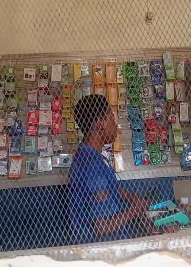 A medium shot shows a person in a blue shirt standing behind a counter in a small shop or kiosk. The person is dark-skinned, with short hair, and appears to be focused on something in front of them on the counter. The counter is made of a rough, light-colored material and has a blue trim. A wire mesh separates the person from the viewer. The backdrop of the kiosk is a wall covered with a variety of small packaged items hanging on hooks. These items are mostly electronic accessories like chargers, earphones, and screen protectors, with a mix of colors and packaging designs. The ceiling is white with a simple light fixture. The overall impression is a small, enclosed retail space with the person managing the inventory. The audio contains local music.