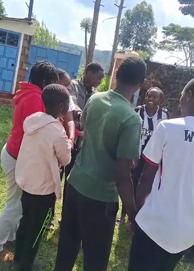 A group of ten to twelve young people stand in a circle on a grassy lawn, holding hands and dancing
