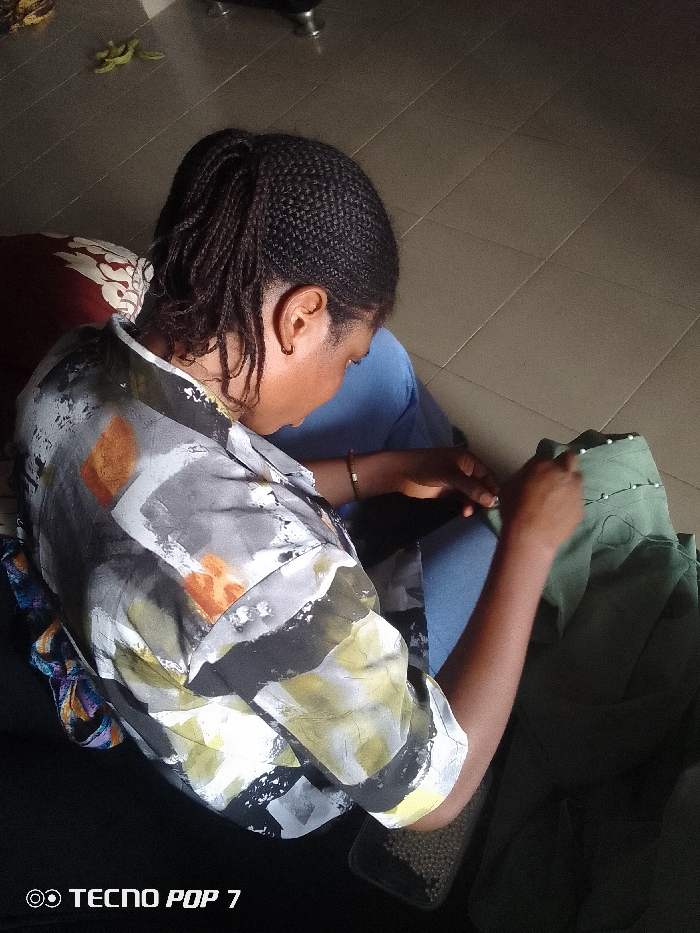 The scene depicts an individual inside a building in the city of Unknown, Unknown. An adult female with dark skin and braided hair, styled into a ponytail, is seated on a surface, possibly a cushion or sofa, partially obscured on the left by a red-patterned fabric. She wears a short-sleeved collared shirt with an abstract pattern of grey, white, orange, yellow, and black, and blue trousers. A light-colored bracelet adorns her left wrist. She is engaged in hand-sewing or tailoring, manipulating a piece of dark green fabric or garment. Multiple white pins are visible inserted along an edge of the green fabric, indicating preparation for a seam or hem. Her gaze is directed downwards at her work. The immediate environment includes a light brown tiled floor, which extends throughout the visible area. In the upper left background, a small, green, lizard-shaped object rests on the floor. Further back, metallic furniture legs are visible. A dark surface is partially visible beneath the individual's left leg, and a clear smartphone case with small, dark beads is near her right leg. The image bears a "◎ TECNO POP 7" watermark in the lower left corner.