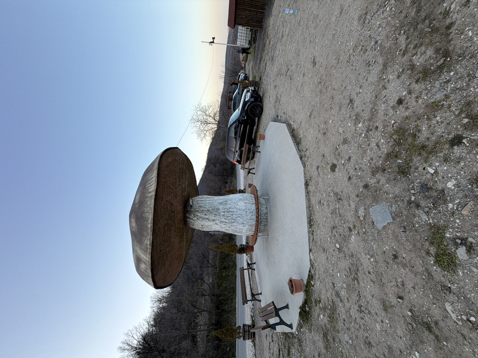 The image depicts a roadside scene in Sveti Konstantin, Bulgaria, dominated by a large, artificial mushroom sculpture