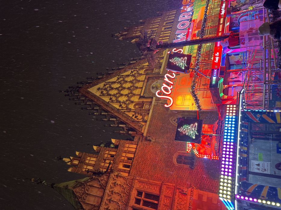 A vibrant and festive Christmas market is set against the backdrop of historic architecture. Multicolored lights illuminate a towering carnival ride with signs reading "MORRIS'S" and "Santa's." The building's intricate gothic design contrasts with the modern, flashing lights of the market. Snowflakes fall against the dark sky, enhancing the wintery ambiance. The juxtaposition of old and new, classic architecture and contemporary celebration, creates a unique visual experience.