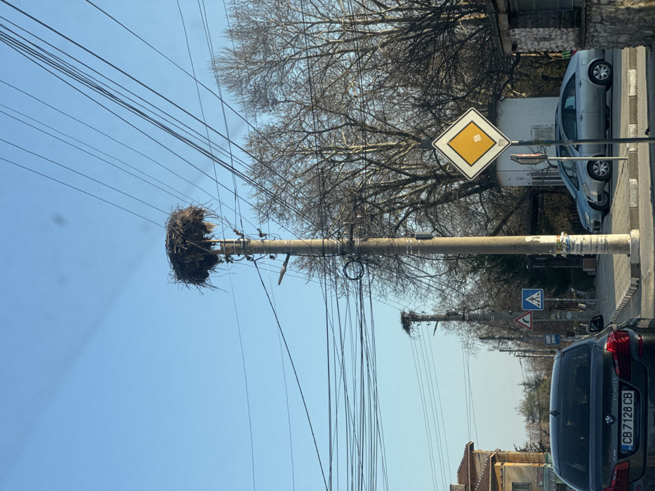 The image depicts a daytime street scene in Vinogradets, Bulgaria, characterized by utility infrastructure and bare deciduous trees under a clear blue sky. In the foreground, a prominent concrete utility pole supports a large, circular stork nest constructed from branches and debris. This pole is heavily laden with numerous black electrical and communication wires. A second, similar utility pole with another stork nest is visible further down the street on the left. On the immediate right, a diamond-shaped road sign indicating "priority road" is present. To the left, a dark-colored BMW sedan with Bulgarian license plate CB 7128 CB is parked or moving slowly, viewed from the rear. Further down the street on the left, other road signs are visible, including a pedestrian crossing sign and a warning sign. Several parked vehicles, including at least two light-colored sedans, are visible on the right side of the road. Buildings line the street; a light-colored structure with a tiled roof is partially visible on the far left, and a small white building with a dark roof is behind the parked cars on the right. Bare-branched trees, consistent with a late winter or early spring season, frame the background. No people or animals are explicitly visible, and no dynamic actions are captured beyond the static presence of vehicles.