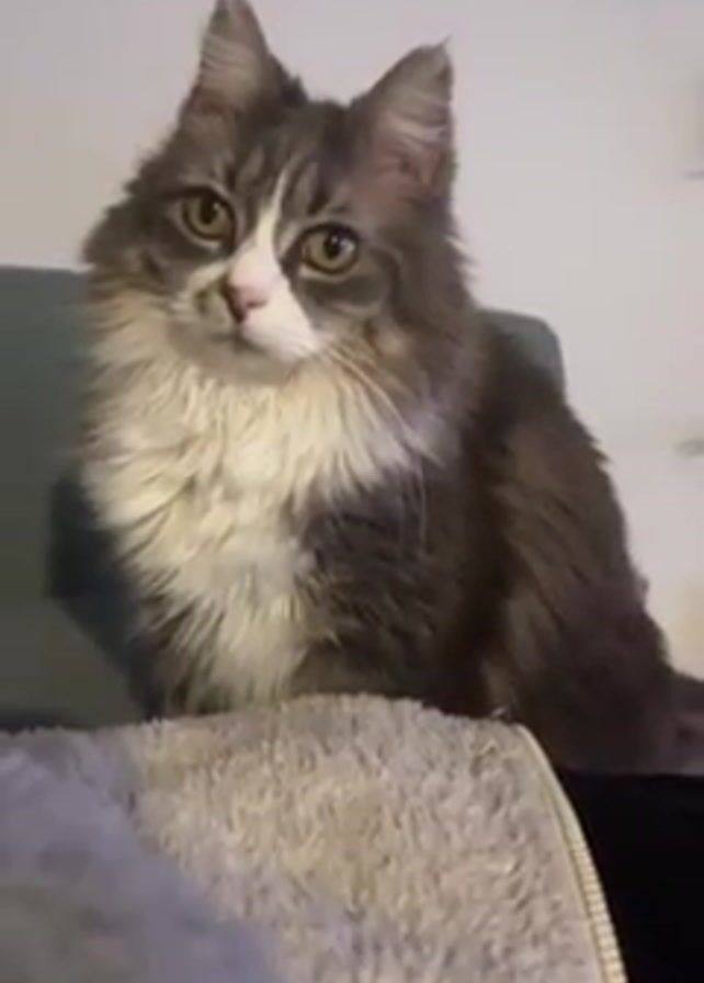 A medium shot shows a grey and white fluffy cat sitting on a couch