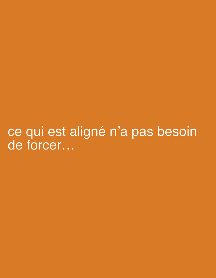 An orange background displays white text in a sans-serif font. The text reads, "ce qui est aligné n'a pas besoin de forcer..." The words are arranged in three lines near the bottom of the image. The overall composition is simple and emphasizes the message conveyed by the text.