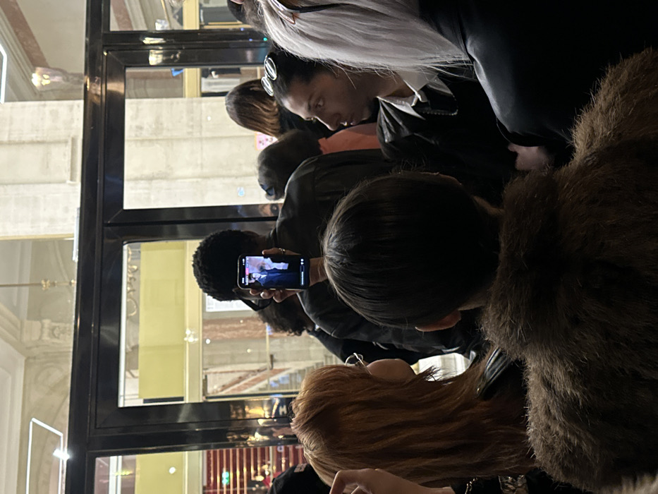 The image captures an indoor crowd scene within a grand, ornate building in Paris, France, consistent with the architectural style of the Opéra Garnier. In the foreground, facing away from the viewer, is a person with short, dark hair wearing a brown, fur-textured coat. To their left, the back and partial profile of an individual with long, reddish-brown hair and glasses are visible. Central to the frame, another person with dark, short curly hair, also wearing glasses, holds a silver-colored smartphone (consistent with an iPhone) vertically, pointing it towards the background through large glass doors. The phone screen displays an image of a person in a dark suit. To the right, a person with dark hair pulled back, wearing a white collared shirt under a dark jacket, and sunglasses perched on their head, is seen in profile looking forward. A portion of a person with long, white hair is visible on the far right. The crowd is oriented towards a set of large, dark-framed glass doors. Beyond these doors, architectural elements such as ornate classical columns, decorative moldings on high ceilings, and a red carpet are discernible, indicating a formal event or public space. The lighting suggests an interior setting with light sources both within the room and reflecting from beyond the glass doors.