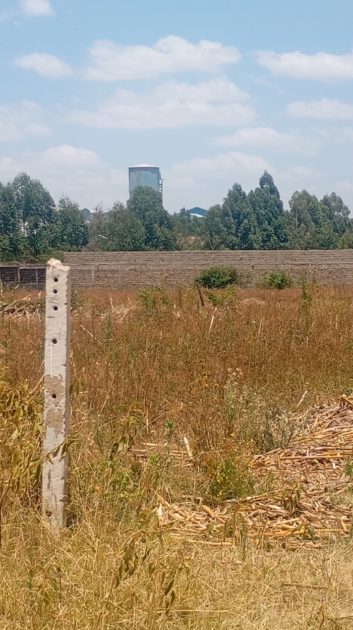 This image captures an unpopulated outdoor environment in Mosop ward, Kenya, under a sky with scattered white cumulus clouds. In the immediate foreground, a weathered, light gray concrete fence post featuring seven uniformly drilled circular holes stands vertically on the left. The ground is covered extensively by dry, yellow-brown grass and weeds. To the right, a substantial pile of dried, light brown plant stalks, consistent with sugarcane residue, rests on the ground, partially obscured by the vegetation. The midground is marked by a dark, segmented wall, appearing to be constructed from stacked blocks or stones, extending horizontally across the frame. Behind this wall, a dense line of mature green trees is visible. In the background, a prominent, light blue cylindrical water tower with a conical roof rises above the treeline. No human subjects, actions, or interactions are discernible.
