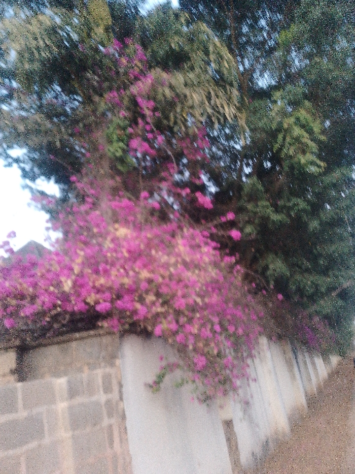 This image depicts an outdoor scene in Barikin Jirga Summa, Nigeria. The central subject is a vibrant bougainvillea plant laden with numerous bright pink/magenta flowers, cascading over a structural element. A large tree with dense, dark green foliage occupies the background and upper portion of the frame. In the lower left, a section of a grey concrete block wall is partially visible beneath the bougainvillea. To the right, a lighter-colored, possibly white-painted wall or pillar extends, bordering an unpaved, reddish-brown ground surface, likely a dirt path or road. No people or animals are present. The scene is illuminated by natural light, and the image exhibits significant blur and digital noise.
