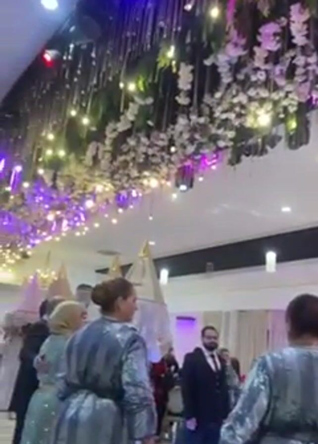 group of people in what appears to be a wedding reception setting. There are several people in formal attire, including women wearing matching light blue and silver dresses with horizontal stripes. A man in a suit and tie is visible among the crowd, possibly speaking or singing into a microphone. The environment is decorated with an elaborate floral arrangement hanging from the ceiling, interspersed with string lights in purple and white. The floor is patterned. People are moving around, likely dancing or socializing, and one person is holding a camera, possibly filming the event. Several veiled tents are visible in the background.
