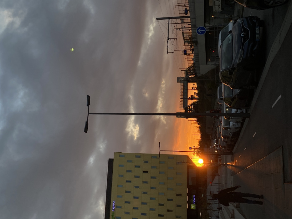 This image depicts an urban street scene at sunset in Nice, France, specifically on Avenue Thiers near the Nice-Ville train station. The scene is illuminated by the low-angle, intense orange and red light of the setting sun, which is partially obscured on the lower-left horizon. The sky above is predominantly overcast with dark grey clouds, featuring patches of lighter sky towards the horizon. On the left, a multi-story building, identifiable as the Holiday Inn Express hotel by its visible signage, features a distinctive yellow facade with numerous rectangular windows. In the lower-left foreground, a single individual, silhouetted, walks away from the viewer on a wet or reflective sidewalk that mirrors the sunset's glow. A double-headed street lamp pole is centrally positioned in the midground. To its right, a line of vehicles is parked parallel to the curb, including a dark blue Renault SUV with license plate ER-361-AL in the immediate foreground. Further into the background, an elevated railway or tram overpass structure with tracks and overhead catenary lines is visible, silhouetted against the vibrant sunset colors. A white circular road sign with an upward-pointing arrow is visible on the right side of the street. A distinct green lens flare or reflection is present in the upper-right portion of the overcast sky.