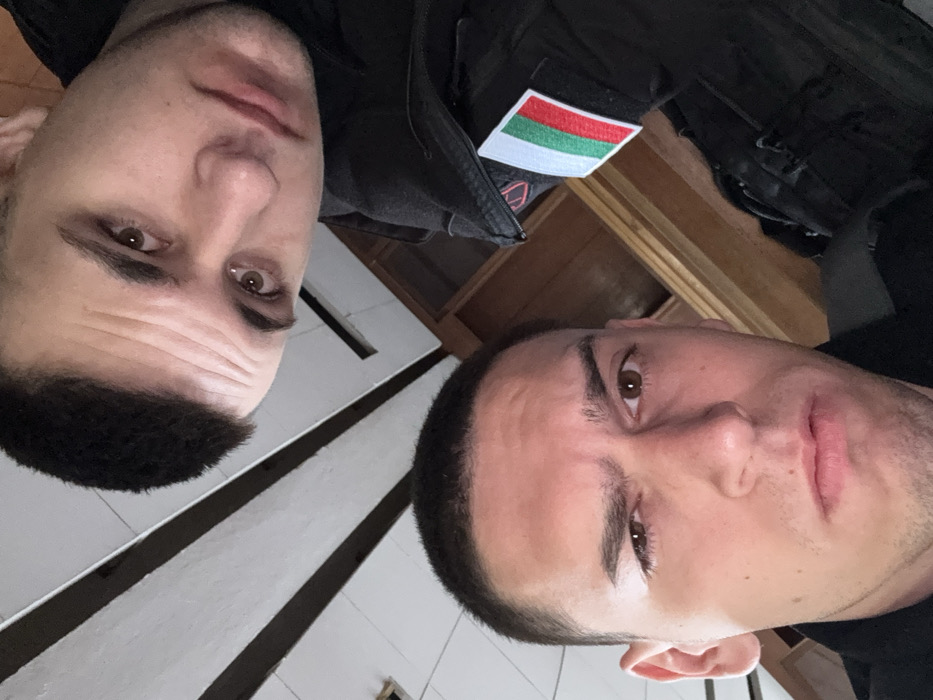 The image displays a close-up, upward-angled portrait of two adult males within an indoor environment. The male in the foreground, positioned bottom-center, has short dark hair, light skin, and brown eyes, exhibiting a focused or stern expression with a slightly raised left eyebrow. The male in the background, positioned upper-right, also has short dark hair, light skin, and light brown eyes, with a neutral expression. Both individuals are looking towards the camera. The background male is wearing a dark-colored garment, possibly a uniform or tactical jacket, featuring a prominent rectangular patch of the Bulgarian national flag (vertical stripes of white, green, and red) on his right sleeve. Above the flag patch, a red insignia or emblem is partially visible. The immediate environment includes a white ceiling with exposed dark wooden beams on the upper left. To the right, behind the subjects, visible elements suggest an interior structure, possibly wooden paneling or a staircase, with a faint rectangular opening. While the Bulgarian flag patch strongly indicates a national context, the precise location within the city of Sofia, Bulgaria, cannot be identified from the specific visual details of the interior setting.