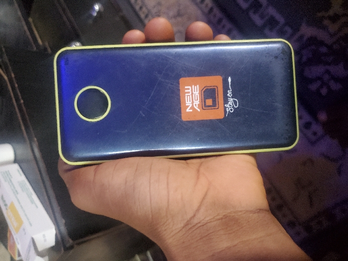 A human hand with medium to dark skin tone holds a dark blue, rectangular portable electronic device with a prominent yellow border. The device's rear surface features a yellow-rimmed black circular element near the top, an orange 'NEW AGE' logo with a SIM card icon, and a white 'Stayon' inscription. The device exhibits numerous scratches and signs of wear. The blurred background reveals a dark surface with a white rectangular package and a white bottle on the left, and a dark patterned floor covering below. The image does not contain visual information to identify a specific location within Minna, Nigeria.