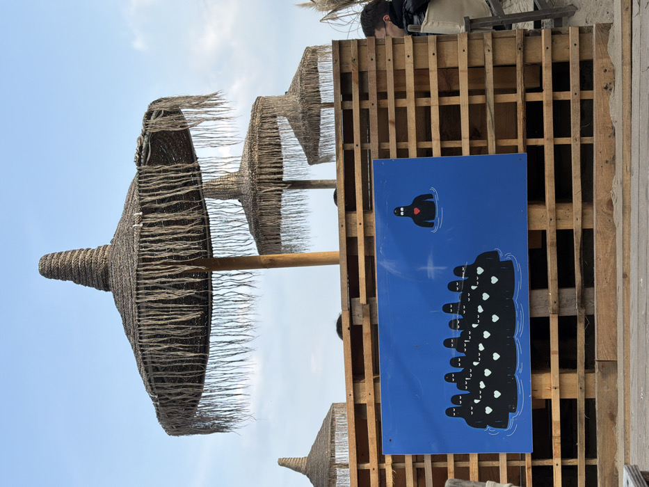The image depicts a beachside setting, likely in Varna, Bulgaria. In the upper frame, four large, conical beach umbrellas with extensive dark, fringed straw canopies are visible against a clear blue sky with minimal white clouds. The largest umbrella is centrally positioned. A horizontal barrier, constructed from stacked light-colored wooden pallets, spans the mid-ground. Affixed to the pallet wall is a rectangular blue signboard displaying stylized artwork. This artwork features a group of approximately ten black, featureless human-like figures, each with a white heart on its chest, depicted partially submerged in blue water and clustered closely on the left side of the sign. To the right, a single, identical black figure with a white heart is depicted separately and further out in the same blue water, visually isolated from the group. To the far right of the frame, partially obscured by the pallet wall, a person with short dark hair, wearing a dark jacket, is seated in a light-colored canvas chair, facing left. The ground in the immediate foreground consists of light-colored sand or dirt, with a wooden plank running horizontally.
