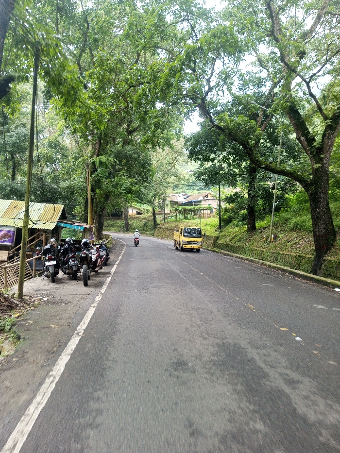 A road winds through lush greenery, a small yellow truck heading uphill. A lone motorcyclist is further up the road. Several parked motorcycles cluster near a small building with a green corrugated roof on the roadside. Overhanging trees create a canopy, filtering sunlight. The road surface is dark asphalt, with a white line marking the edge. A stone wall lines the right side of the road. Distant buildings are visible through the trees.