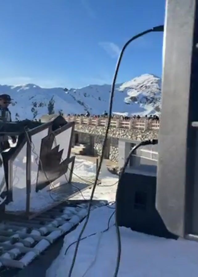 party scene on a snowy mountain. Two DJs are on a snowcat labeled "PHIERES," with mountains in the background. The snowcat is rigged with speakers and a backdrop with the image of a maple leaf. People are dancing and socializing in the snow. The weather appears sunny. A building is visible in the background.