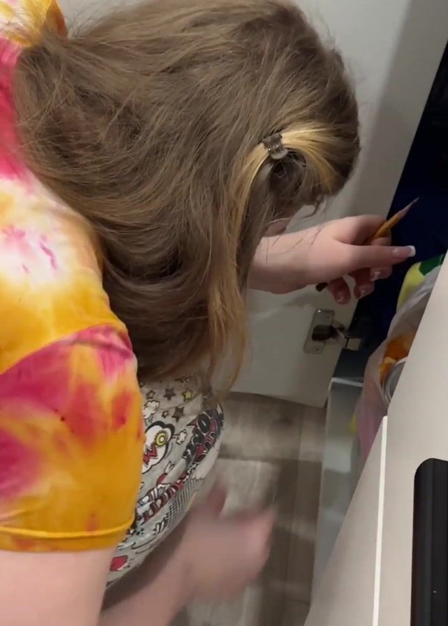 A young woman is on her knees, reaching into a white cabinet with black handles. She is wearing a tie-dye shirt and patterned pajama pants. The woman has long, brown hair that is partially pulled back with a small clip. She is using a pencil to point or guide something within the cabinet. The cabinet appears to contain some items, including what seems to be oranges in a bag and a can. The floor is light-colored wood. The woman's face is not visible.