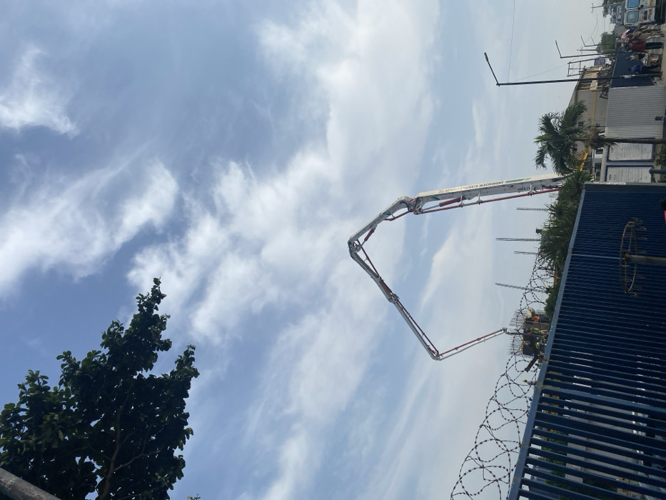 The image depicts an outdoor, daytime scene in Akowonjo, Nigeria, showcasing a construction site adjacent to a public street. The sky is largely blue with scattered, wispy white clouds. In the foreground, a dark blue corrugated metal fence, topped with silver concertina wire, runs horizontally across the lower portion of the frame. A green, leafy tree branch partially obscures the upper left corner. Behind the fence, a construction site is active. The primary subject is a large, white and grey concrete pump truck, identifiable by its fully extended, articulated boom arm, which arches towards the center-right of the frame. Red hydraulic lines are visible on the boom, which also features the text "CONCRETE MACHINERY." The boom is positioned over an area of the construction site where multiple vertical rebar structures are visible, indicating ongoing concrete work. At least two construction workers, partially visible in yellow vests, are present near the active construction area. To the right of the fence and extending into the background, a street or road is visible. A tall, black street light pole with a luminaire stands on the right side of the road. Further down the street, multiple buildings, including multi-story structures, are present, interspersed with palm trees. Several individuals are visible on the sidewalk or shoulder of the road, and a white commercial vehicle is partially visible on the far right. Overhead utility lines are strung between poles along the street.