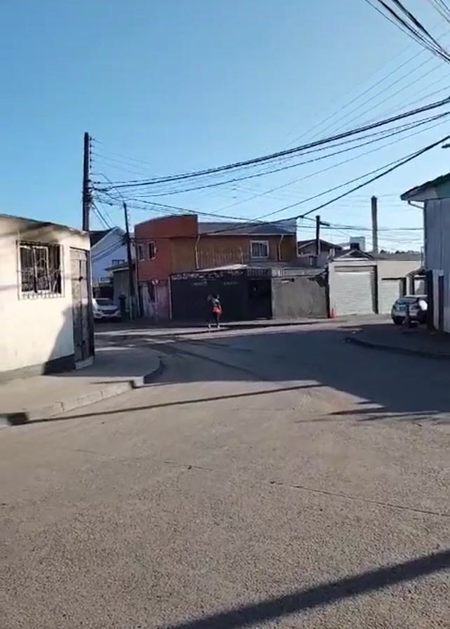 street in what seems to be a small town, perhaps in a rural area. The sky is clear and blue. The road is paved and empty, save for the shadow of the videographer. Several buildings line the street. One structure displays visible fire damage, blackening the facade above the windows and around the door. A flag, red and white, is visible through one of the windows. Graffiti is scrawled on the building. The camera pans from left to right, capturing the street and the buildings. The video seems to be a brief recording of the location, possibly as a form of documentation or record-keeping.