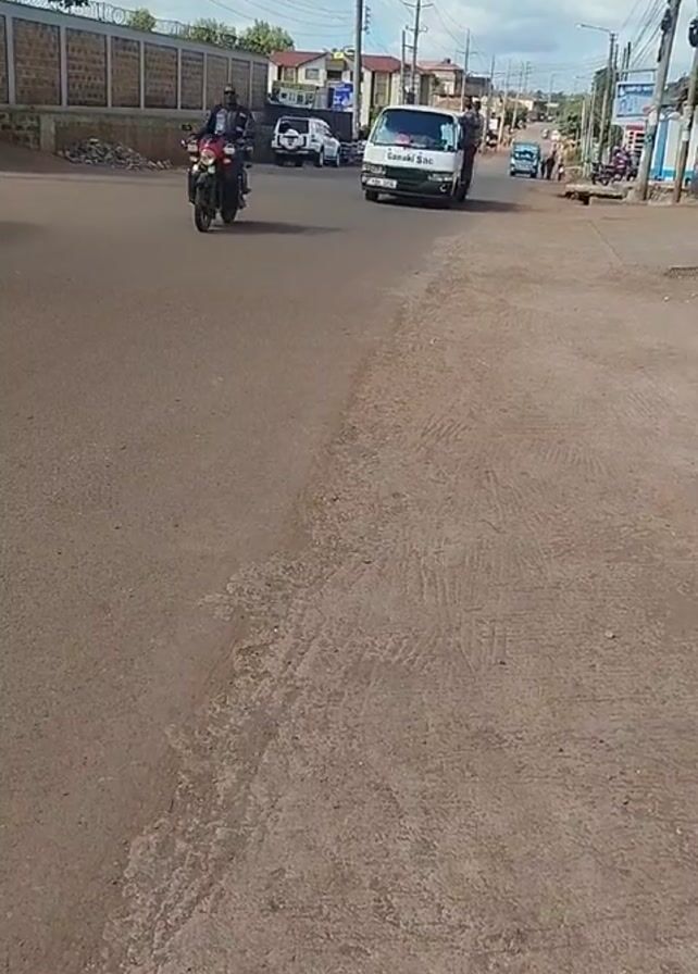 street scene with various vehicles and pedestrians. A motorcycle and a white van with the inscription "Ganaki Sac" on the windshield are moving down the street. Two men are standing in the open doorway of the van as it drives by. There are other vehicles parked or moving in the distance, and pedestrians are visible on the sidewalks. The street surface appears to be paved but somewhat uneven. Overhead are power lines and a blue sky with scattered clouds. The surrounding buildings are a mix of residential and commercial structures. The overall impression is of a typical street scene in a small town or urban neighborhood.