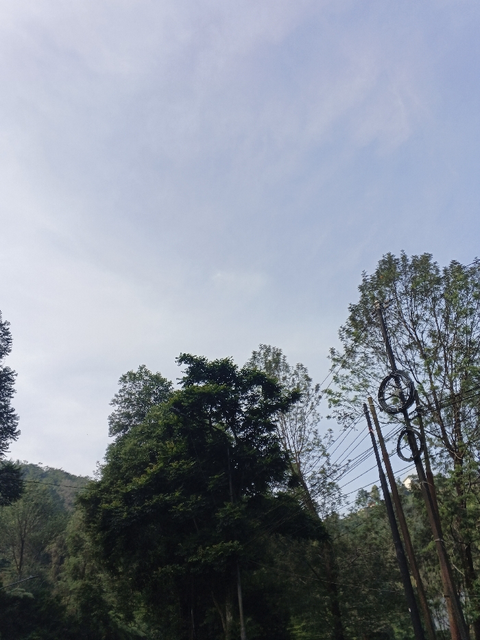 A partly cloudy sky fills the top half of the image. The bottom half features dense trees covering a hillside. In the foreground, tall, dark green trees dominate, while thinner, taller trees with exposed branches are visible to the right, alongside utility poles holding coiled cables. Green foliage partially obscures the hillside in the distance.