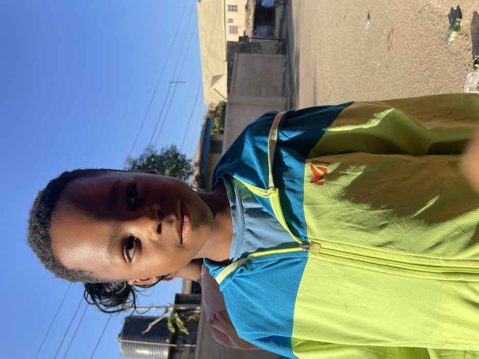 A young Black child stands outdoors on an unpaved street in an urban area of Jos, Nigeria, under a clear blue sky
