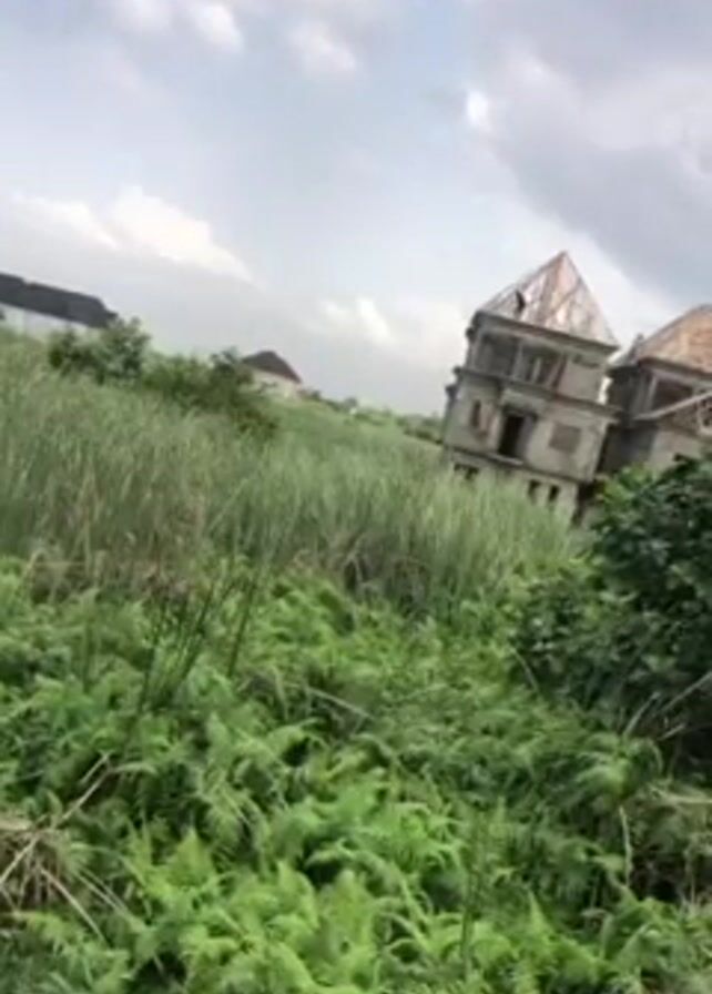 mostly-overgrown field of tall grass and ferns, with a partially-constructed, multi-story building in the background. The building appears to be in a state of abandonment, with exposed beams where the roof should be. In the distance, other buildings with completed roofs can be seen. The sky is overcast. The camera is held at a slightly tilted angle, emphasizing the height of the overgrown vegetation.
