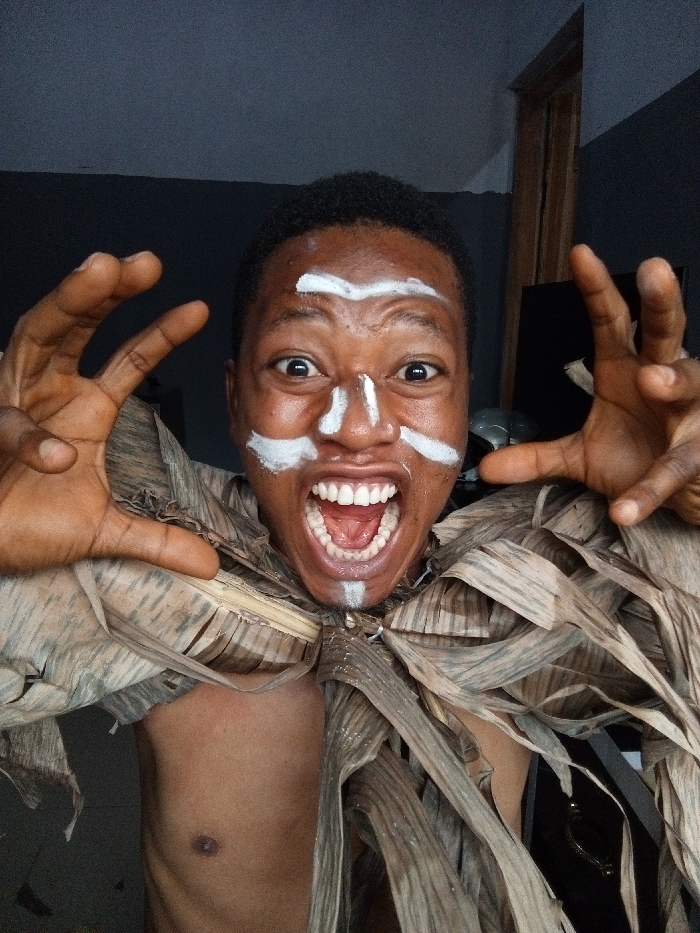 A head-and-shoulders portrait of a dark-skinned individual, identified as being in Aramoko-Ekiti, Nigeria, is captured indoors. The subject, a young adult with short, dark, curly hair, faces directly towards the camera. Their face is covered with white paint applied in distinct patterns: two horizontal stripes above each eyebrow, a vertical line down the bridge of the nose, a horizontal line below the lower lip, and a vertical line on the chin. The individual's eyes are wide open, and their mouth is wide open as if shouting or screaming, revealing upper and lower teeth. Both hands are raised and positioned to the sides of the head, with fingers splayed and slightly curled. The subject wears a costume made of dried, light brown, textured leaves, likely banana leaves, which forms a cape or collar around the neck and shoulders. A portion of the bare chest is visible on the left side of the frame beneath the costume. The background is a dark gray or black wall, with a light-colored door frame partially visible on the upper right side.